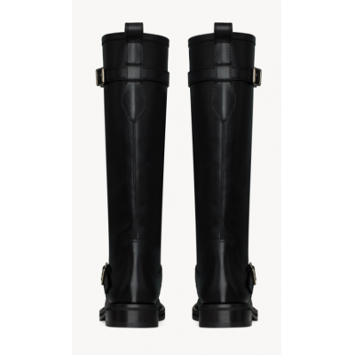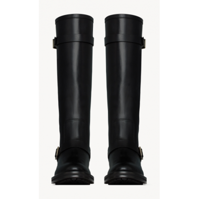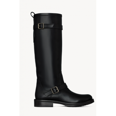 平底骑士靴,设有搭扣和后跟拉袢,搭配圆形鞋头和叠跟。